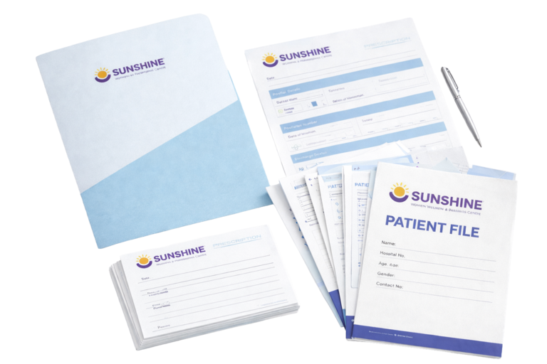 Prescription pads, OP/IP forms, Case sheets, Drug/Treatment Charts, Lab report sheets, Investigation forms, Consent forms, Discharge summaries, Admission forms, Nursing charts, OP/IP registers, Patient files & folders